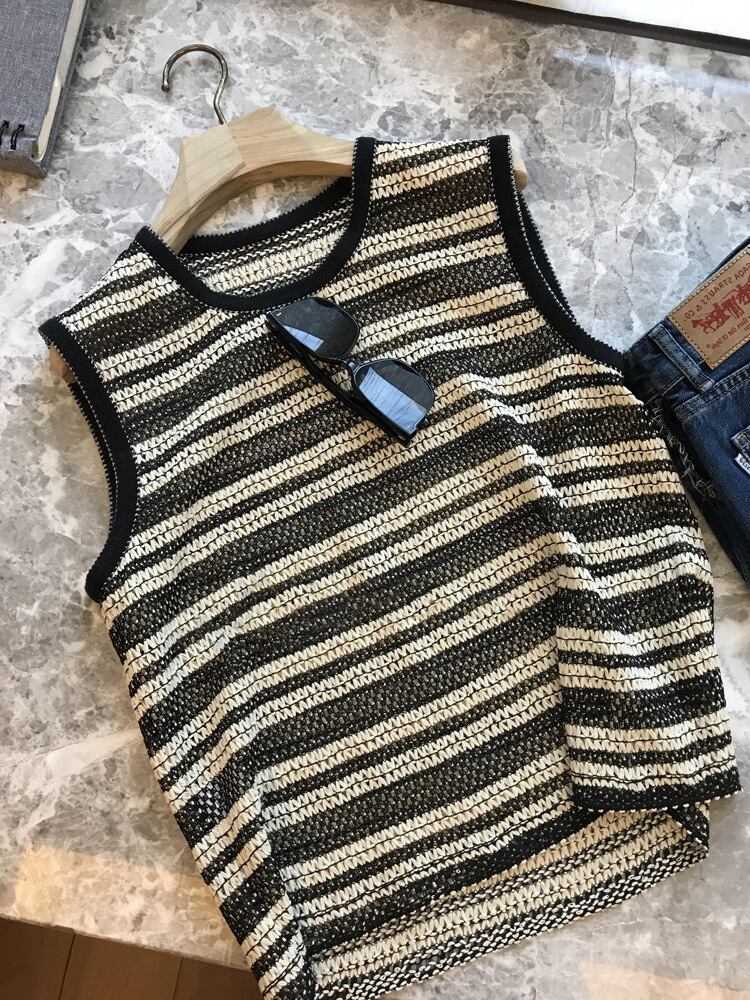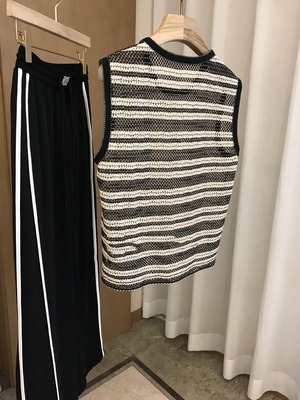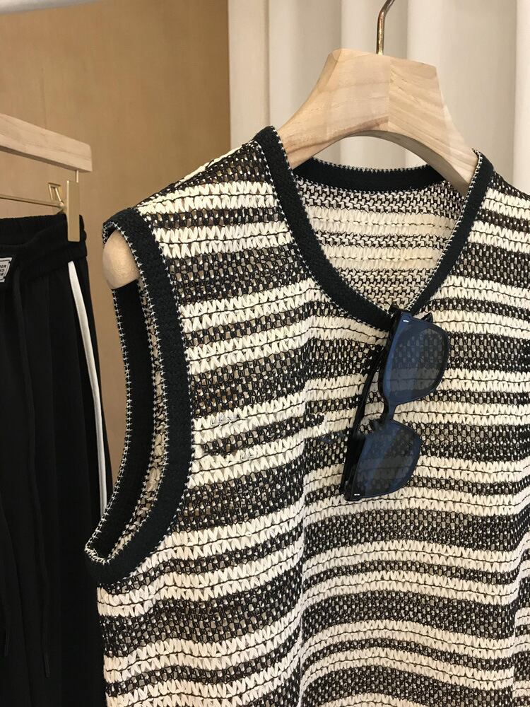 クラシックなボーダーパターンが魅力的なニットベスト。ブラックとホワイトの太めボーダーが印象的で、コーディネートのアクセントになる一枚です。