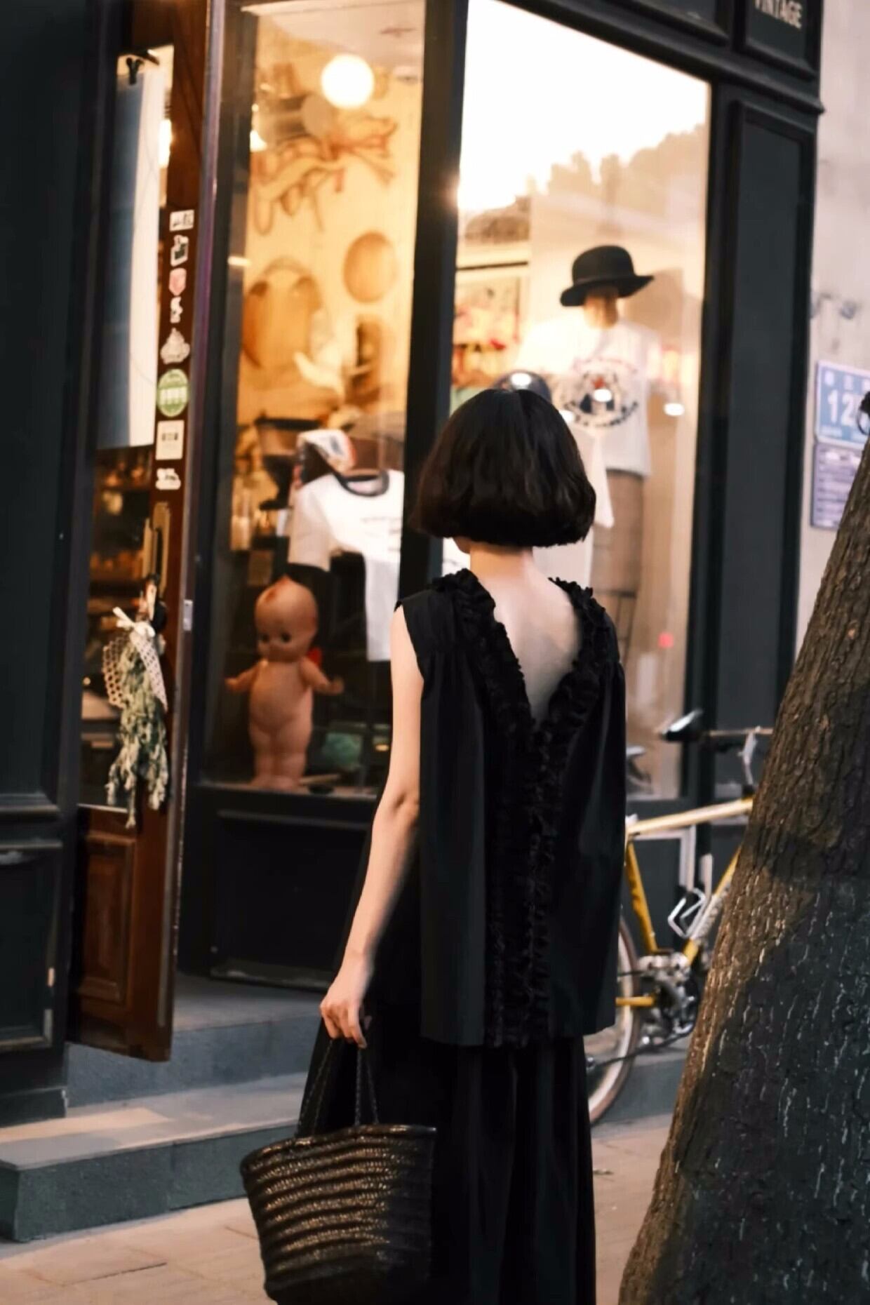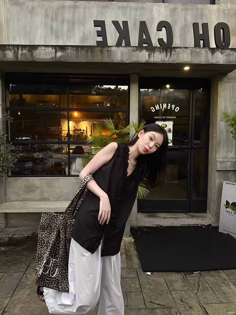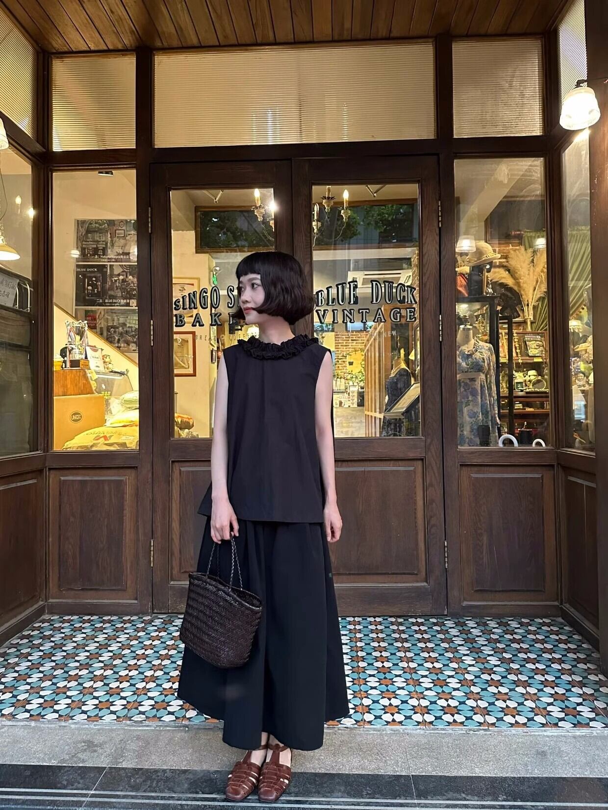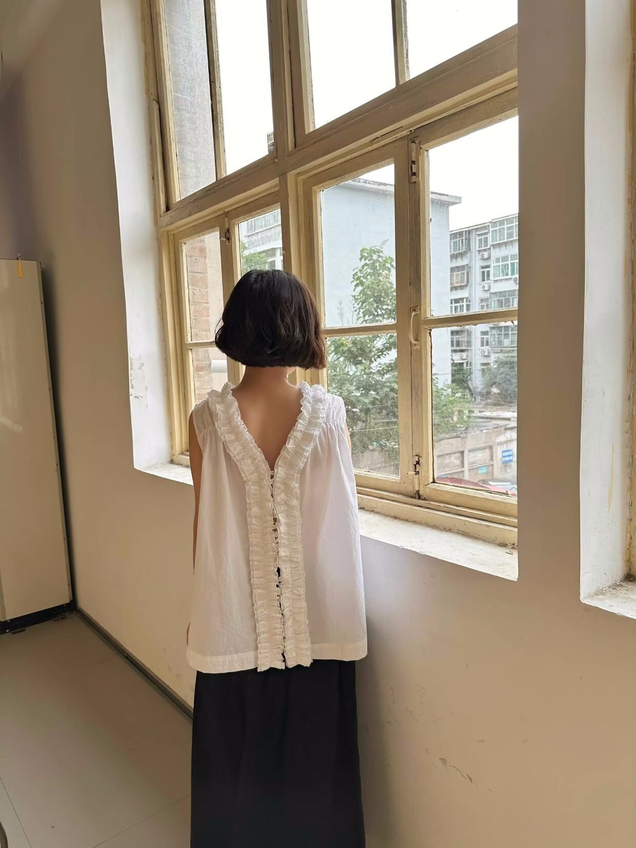 【バック着用時】 背中のフリルディテールがポイントとなり、後ろ姿まで美しく見せてくれます。カジュアルなお出かけスタイルにぴったりです。