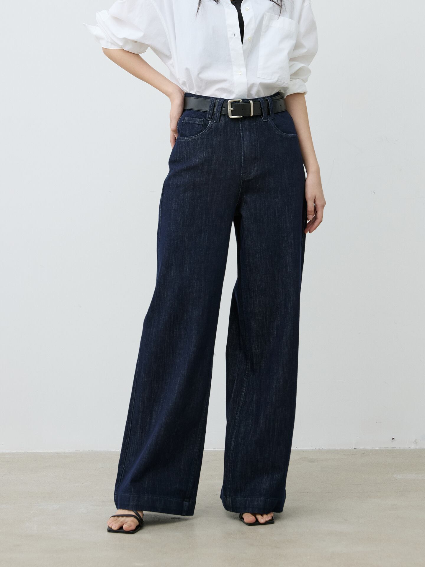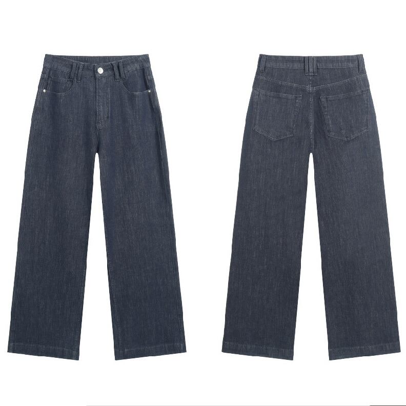 クラシックなハイウエストデザインで、ウエストラインを美しく強調しながら脚長効果も抜群。ゆるやかに広がるワイドシルエットが、体型をカバーしながらもすっきりとした印象を演出します。深みのあるインディゴブルーは、カジュアルからきれいめまで幅広いスタイルに対応し、大人の女性にふさわしい上質な仕上がりです。