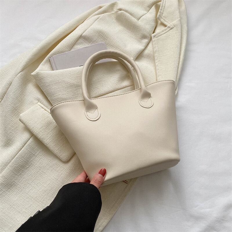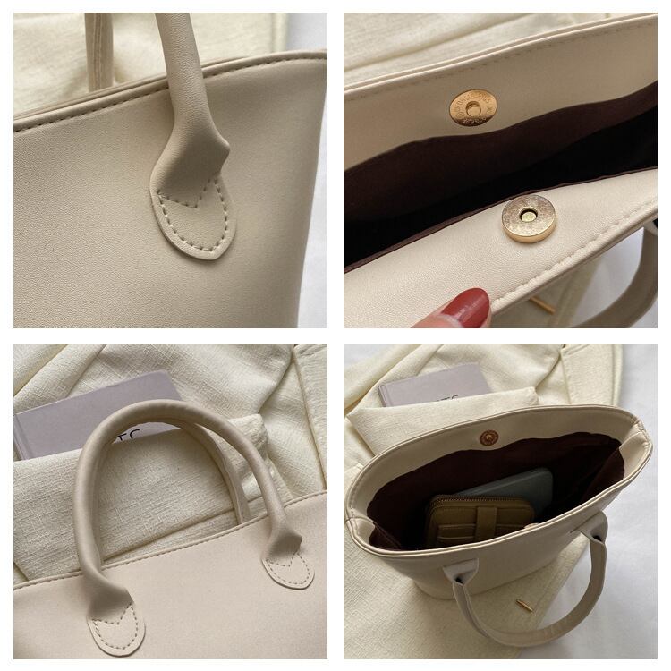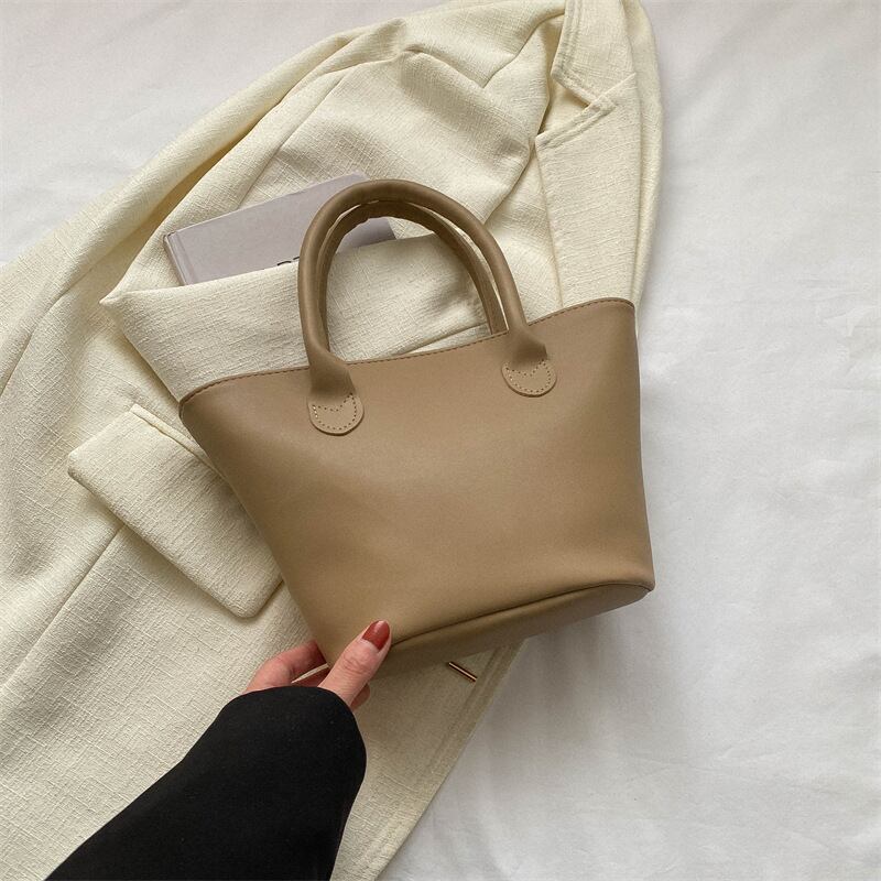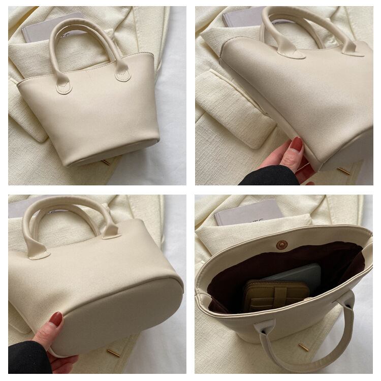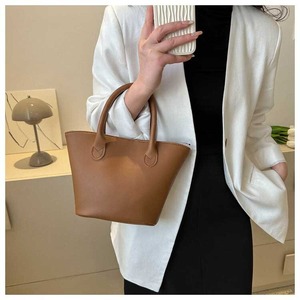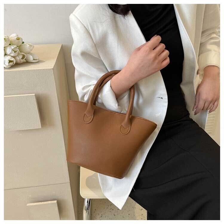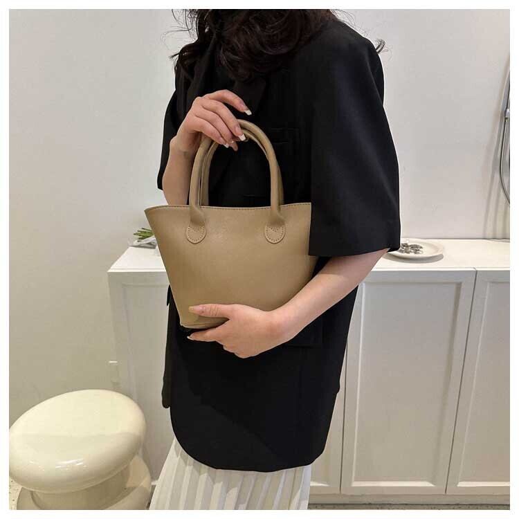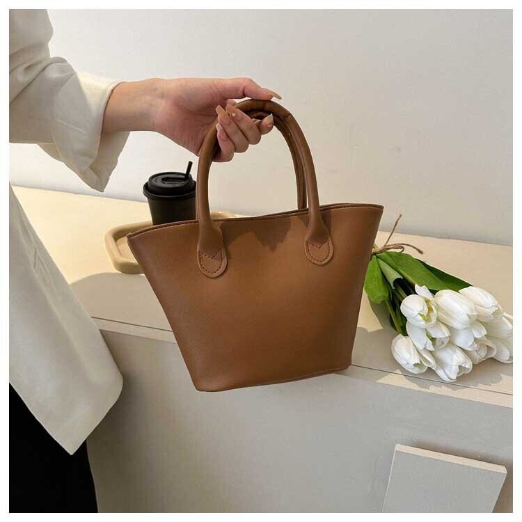 トラペーズ(台形)シルエットが特徴的なコンパクトトートバッグ。上部から底に向かって緩やかに広がるAラインフォルムは、見た目以上の収納力を実現。丸みを帯びた円筒形のハンドルが、優しく手になじみ、長時間の使用でも疲れにくい設計。上質な合成皮革を使用し、本革のような滑らかな質感と高級感を演出。マグネットボタン付きで中身も安心。コンパクトながら必需品がきちんと収まる絶妙なサイズ感で、デイリー使いに最適な、大人の女性のための上品なバッグです。