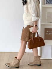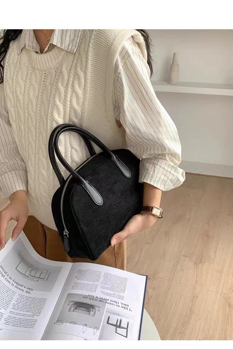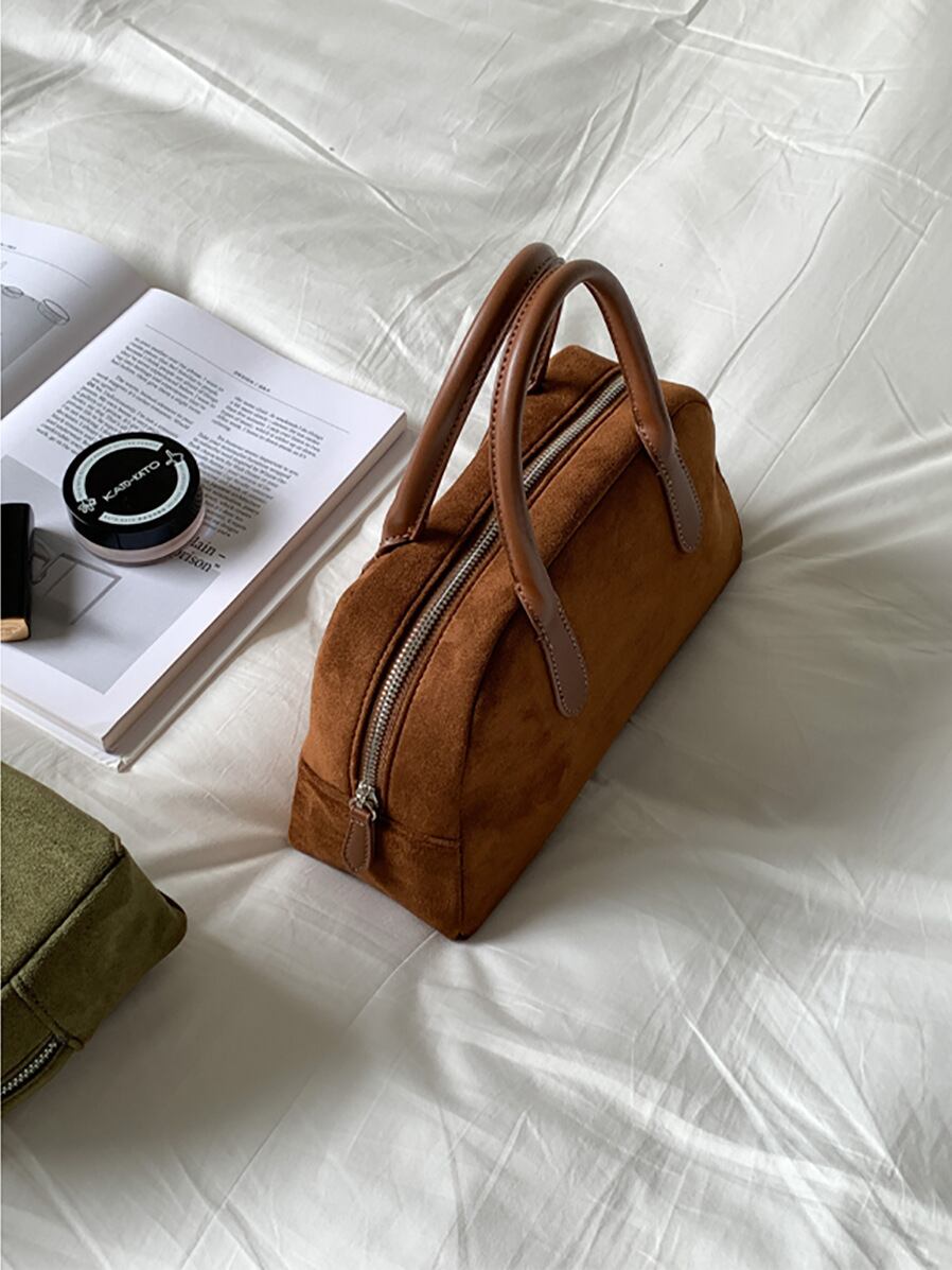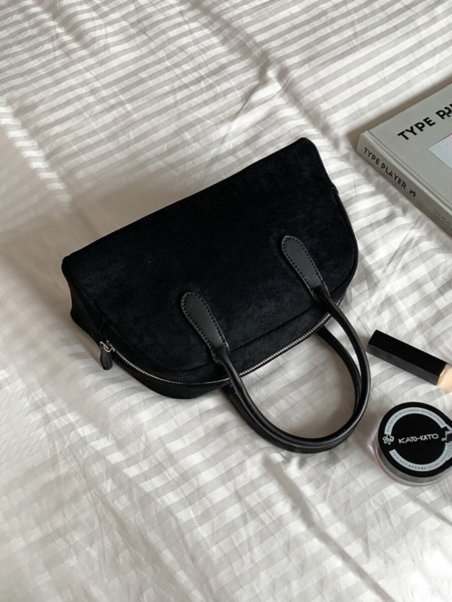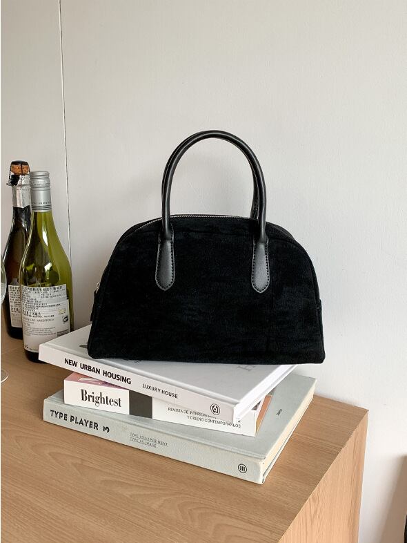 優雅なハーフムーン(半月)型シルエットが印象的なハンドバッグ。上質なスエード調素材を使用し、秋冬らしい温かみのある質感を演出。コンパクトながら丸みを帯びたフォルムで、必要なものをしっかり収納できる実用的なサイズ感。スリムなハンドルとレザー調のトリミングがアクセントとなり、カジュアルにもきれいめスタイルにも合わせやすいデザイン。両サイドのジッパーで開口部を大きく開けることができ、物の出し入れもスムーズ。レトロモダンな雰囲気で、トレンドに左右されない長く愛用できる一品です。