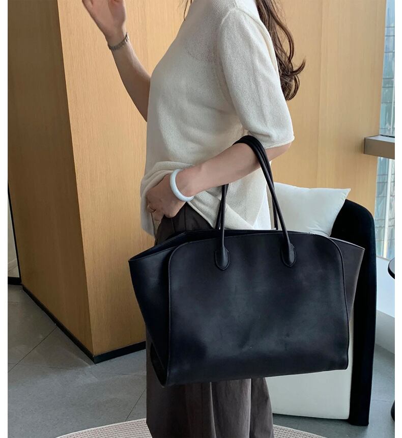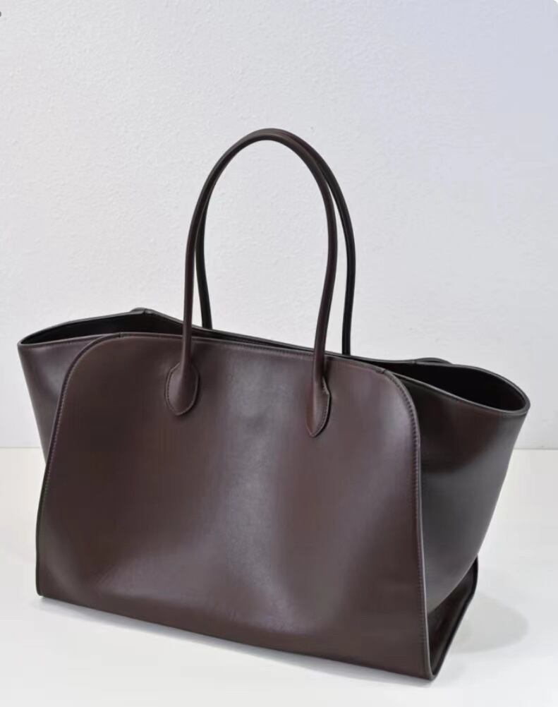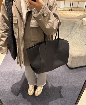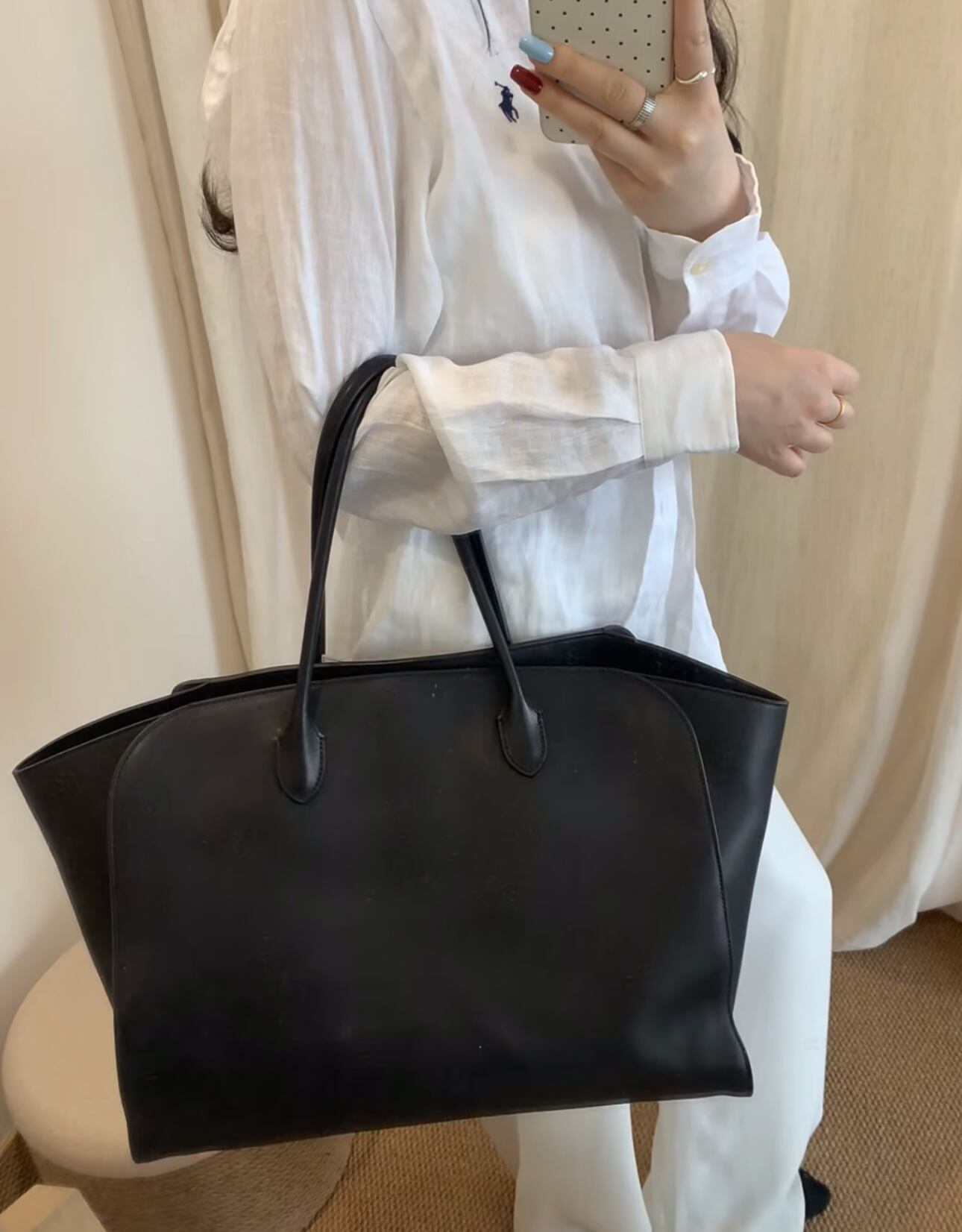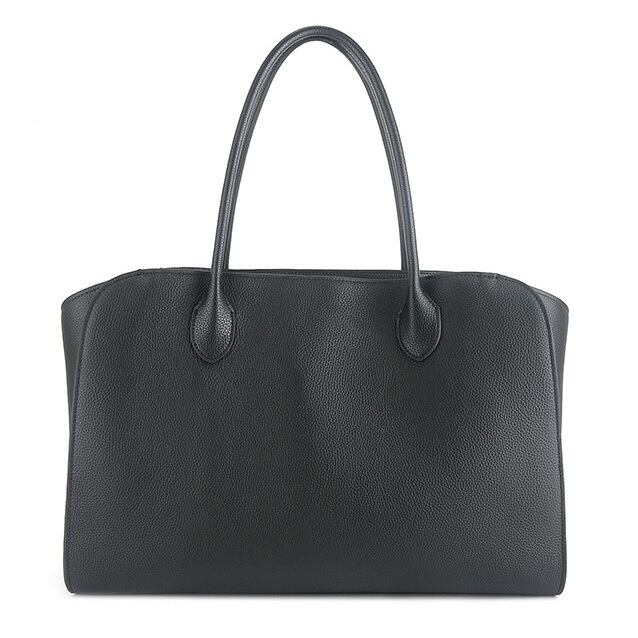 シンプルで洗練されたデザインが魅力的な大容量レザートートバッグ。上質な本牛革を使用し、使い込むほどに味わいが増す経年変化を楽しめる贅沢な仕上がり。緩やかに広がるトラペーズシルエットは、エレガントでありながら実用的な収納力を兼ね備えています。スリムなオーバルハンドルが上品さをプラスし、ビジネスからプライベートまで幅広いシーンで活躍。開口部が広く、A4書類やノートPCも楽々収納可能。内側のポケットで小物も整理しやすく、デイリーユースに最適。時代に左右されないタイムレスなデザインで、長く愛用できる大人の女性のためのマストハブアイテムです。